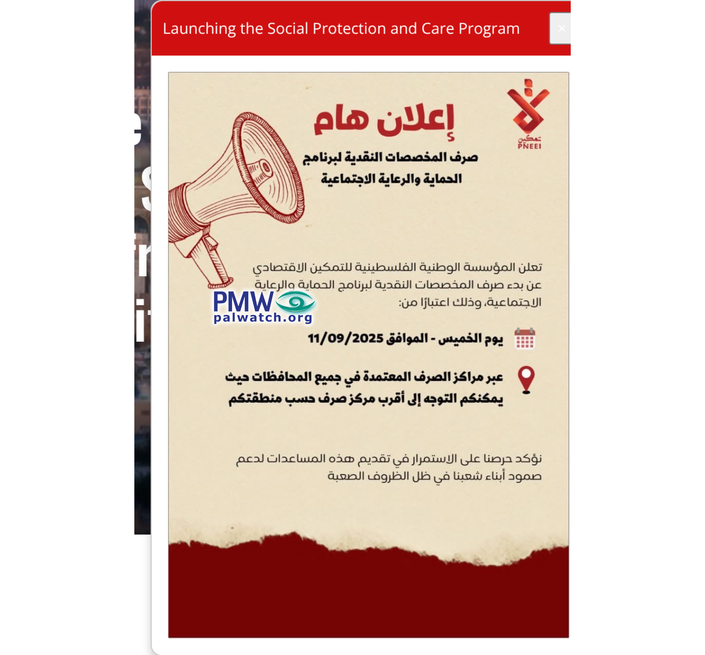 "The Palestinian National Economic Empowerment Institution (PNEEI) announces the payment of financial allowances within the Social Protection and Care Program, starting from Thursday, Sept. 11, 2025, through authorized payment centers."