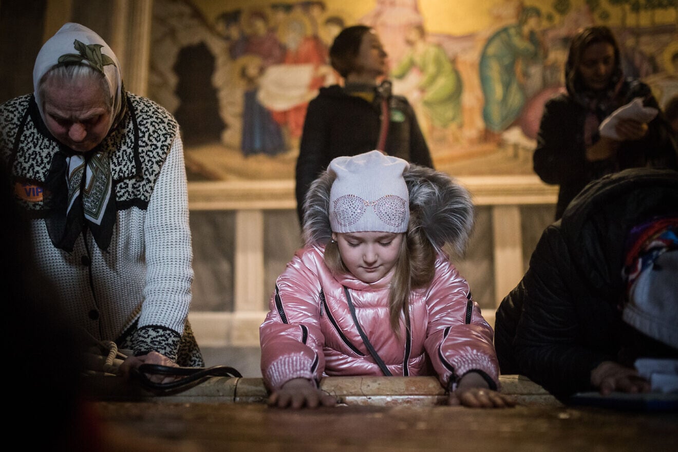 pray at the Stone of Anointing in the Church of the Holy Sepulchre in