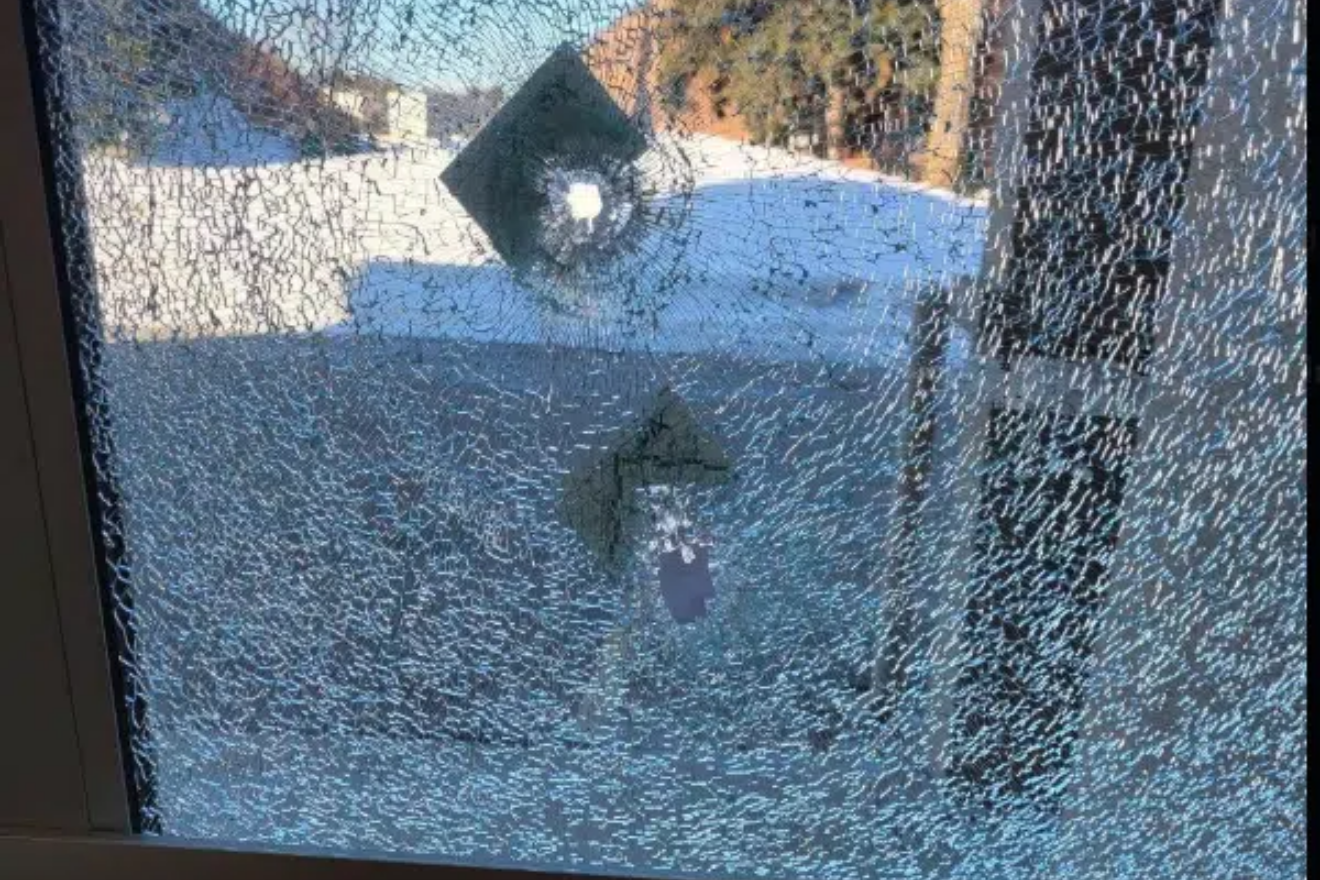 | A window at Temple Emanu-El synagogue in Toronto’s North York district shows bullet damage after gunfire struck the building, March 3, 2026. Credit: CAM. |
